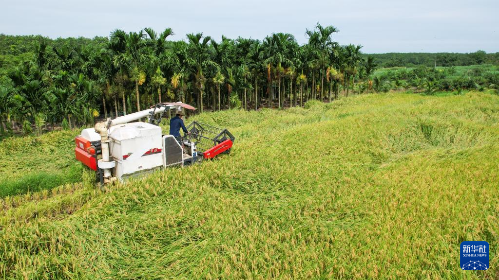 6月18日,在海南省白沙黎族自治县邦溪镇大米村,工人操作收割机收获早稻(无人机照片)。
