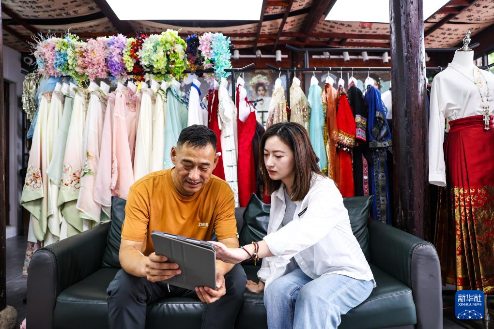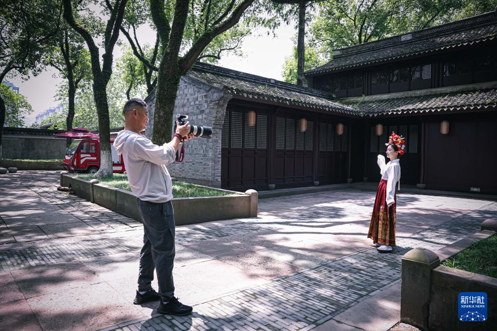 6月18日,旅拍摄影师胡修刚(左)在慈城古县城景区为游客拍照。