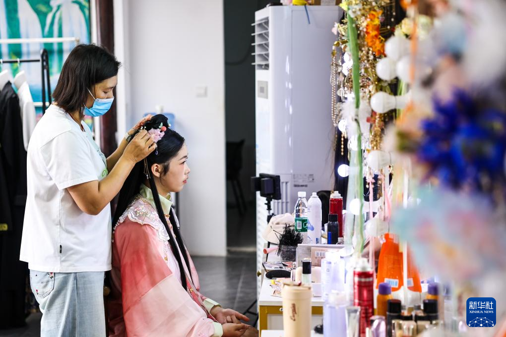 6月18日,游客在慈城古县城景区的旅拍体验馆内化妆。