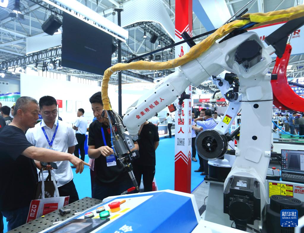 6月18日,参观者在2025青岛国际机床展览会上了解激光焊接机器人。