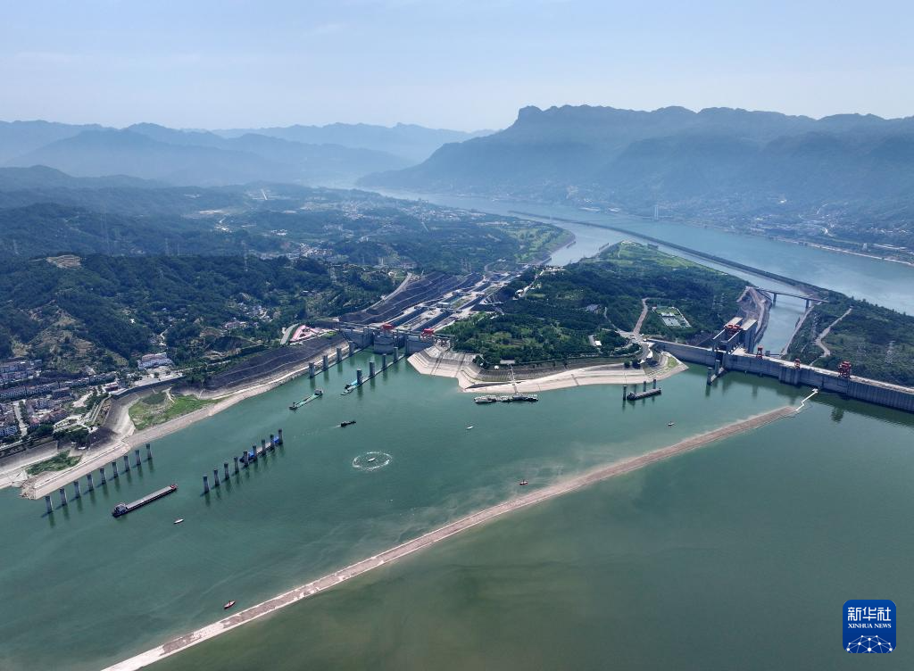 船舶行驶在三峡坝前的湖北省宜昌市夷陵区太平溪水域(6月17日摄,无人机照片)。