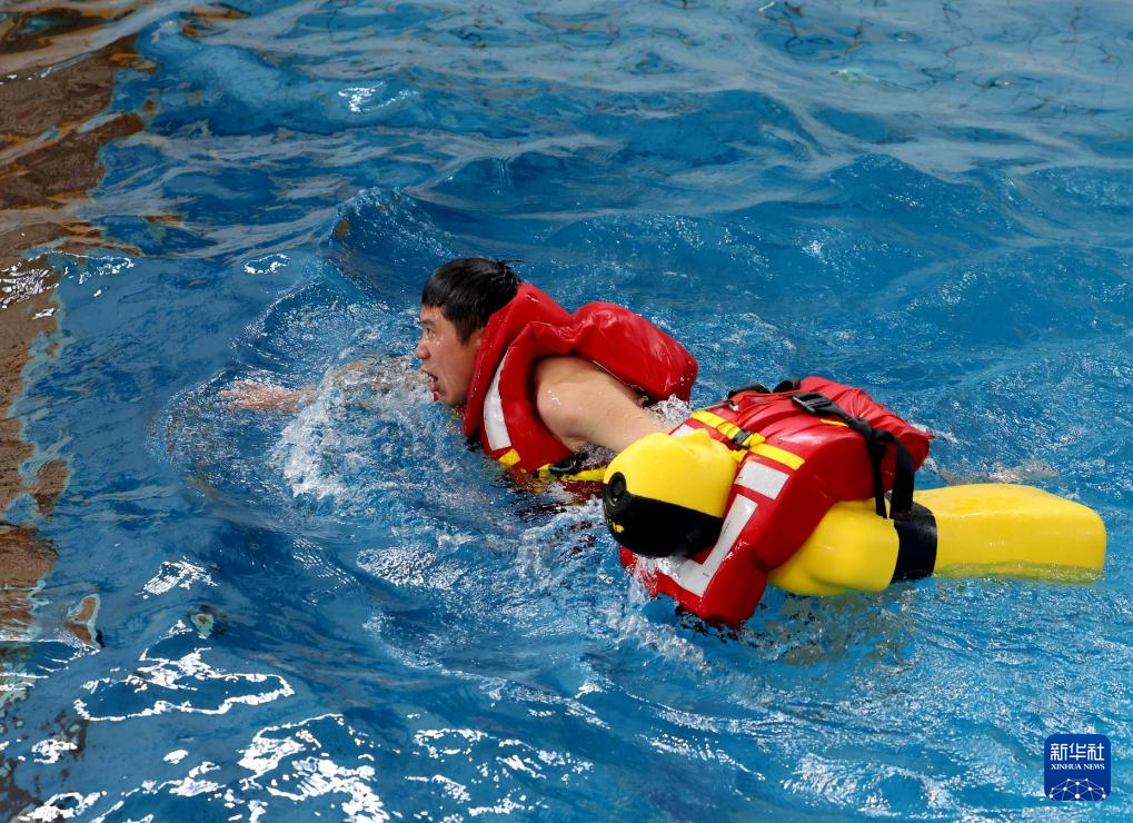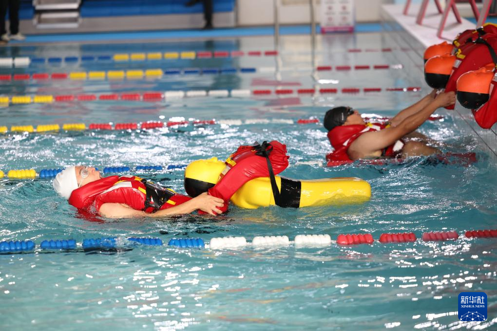 6月19日,在水上求生(海洋组)竞赛现场,一名参赛者拖带假人(被救者)游泳。