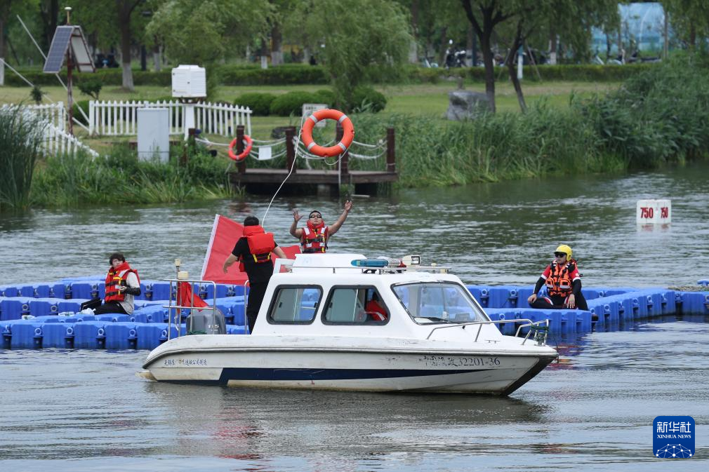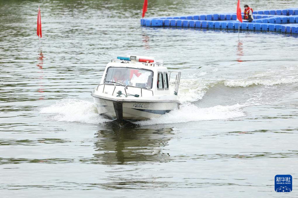 6月19日在上海海洋大学明湖水域拍摄的船艇操纵救援竞赛现场。