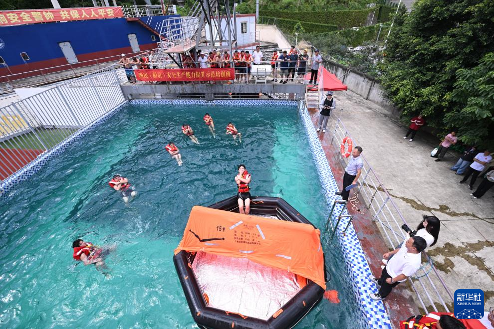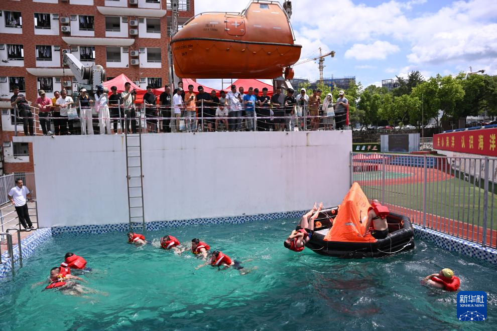 6月19日,参训学员在进行穿戴救生衣基本技能考核。