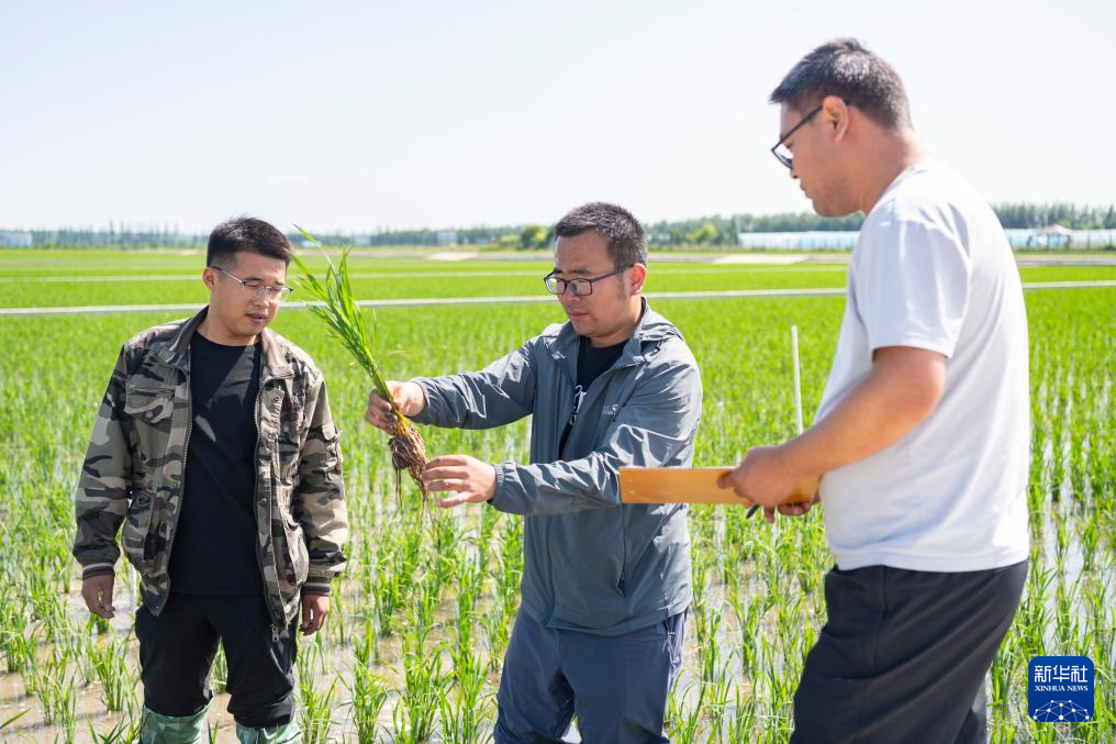 6月18日,在中国水稻研究所北方水稻研究中心的试验田内,科研人员查看水稻根系生长情况。