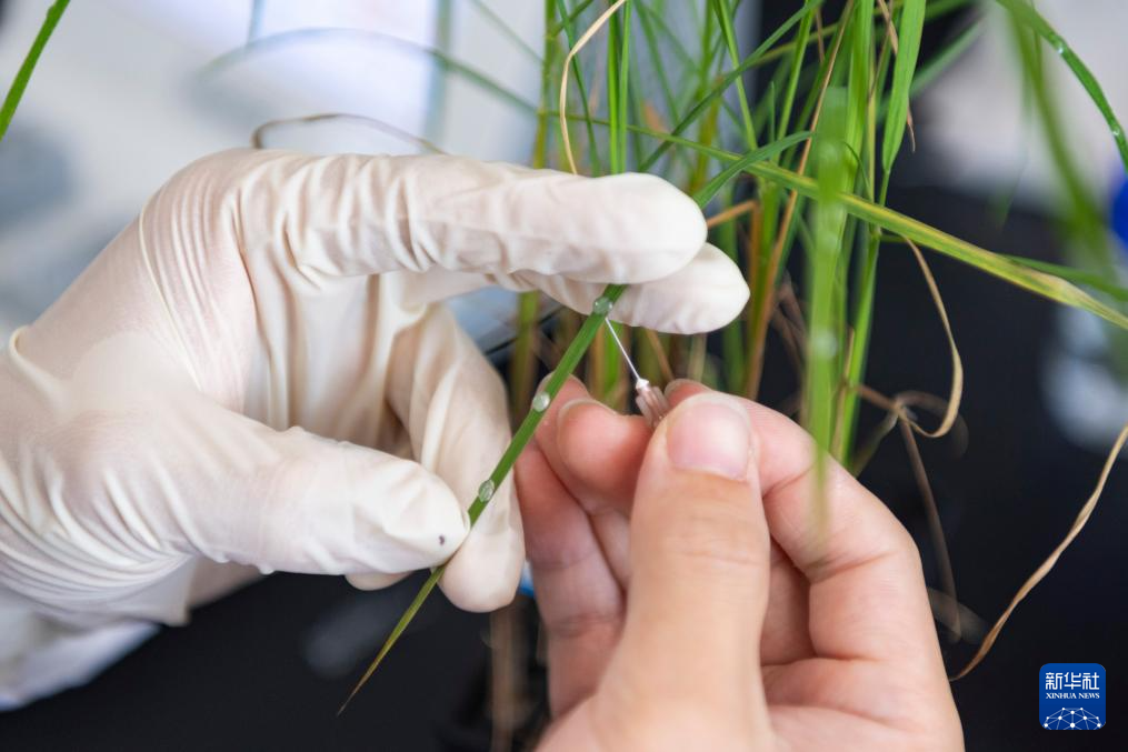6月18日,在中国水稻研究所北方水稻研究中心,科研人员测试水稻对不同化合物的反应。