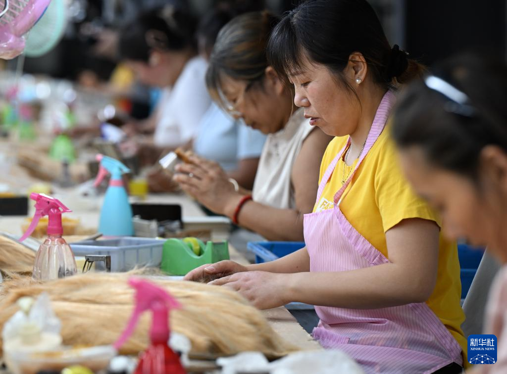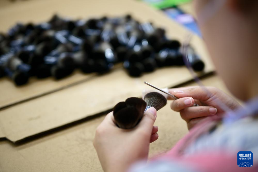6月18日,工人在河南省鹿邑县河南觅己美业科技有限公司的厂房内整理化妆刷半成品。
