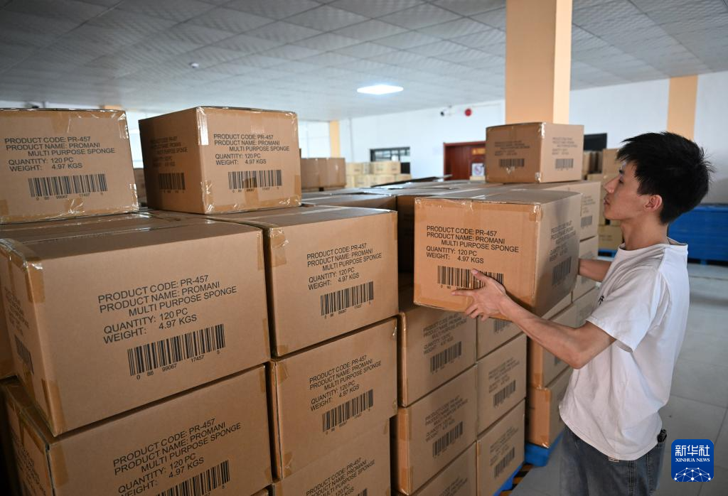 6月18日,工人在河南省鹿邑县河南觅己美业科技有限公司的厂房内打包生产好的化妆刷。
