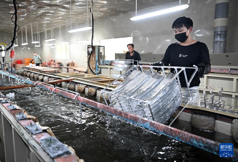 6月17日,工人在河南省鹿邑县中俊实业有限公司的厂房内从架子上取下刚氧化好的用于连接刷毛和刷柄的铝管。