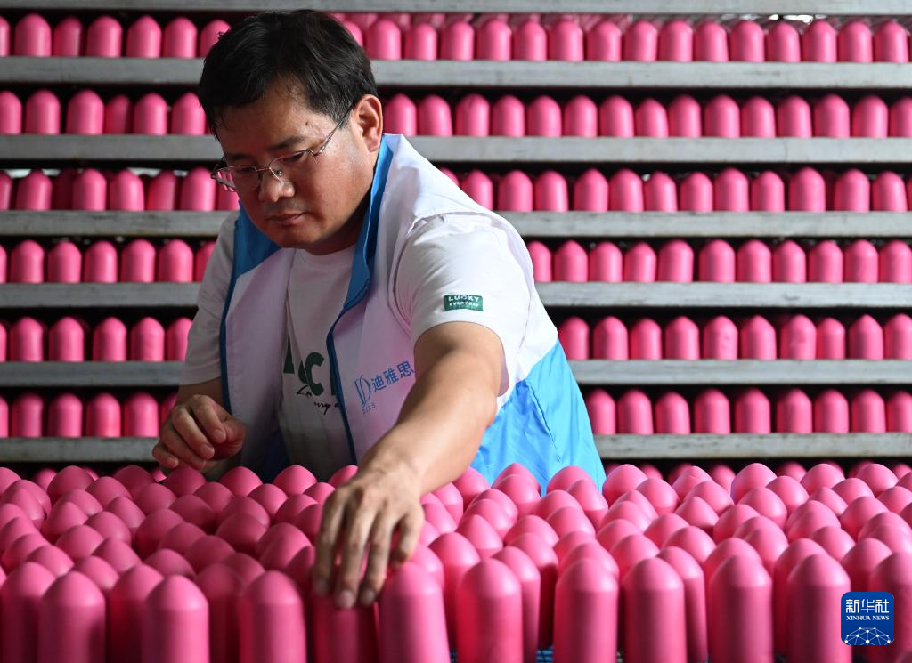 6月18日,工作人员在河南省鹿邑县迪雅思化妆用具有限公司的厂房内整理美妆蛋半成品。