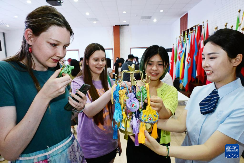 6月20日,国际学生学习识别不同功效的中草药香囊。