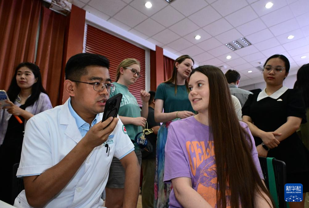 6月20日,青岛西海岸新区中医医院医生李振东(前左)与来自乌克兰的学生华菱通过手机翻译软件问诊交流。