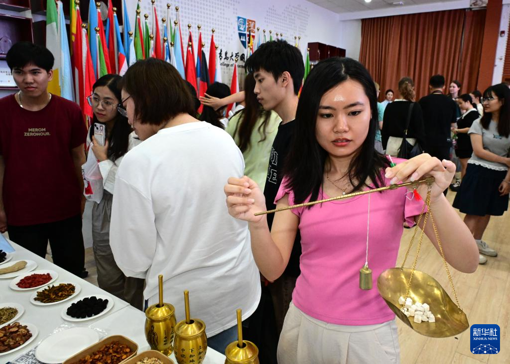 6月20日,青岛西海岸新区中医医院中药师何广云(左一)向国际学生讲解各种中草药的药效。