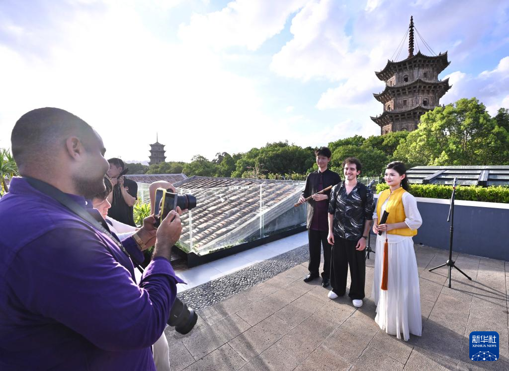 6月20日,在福建泉州西街游客服务中心观景台,一名外籍游客(中)与泉州南音艺人合影。