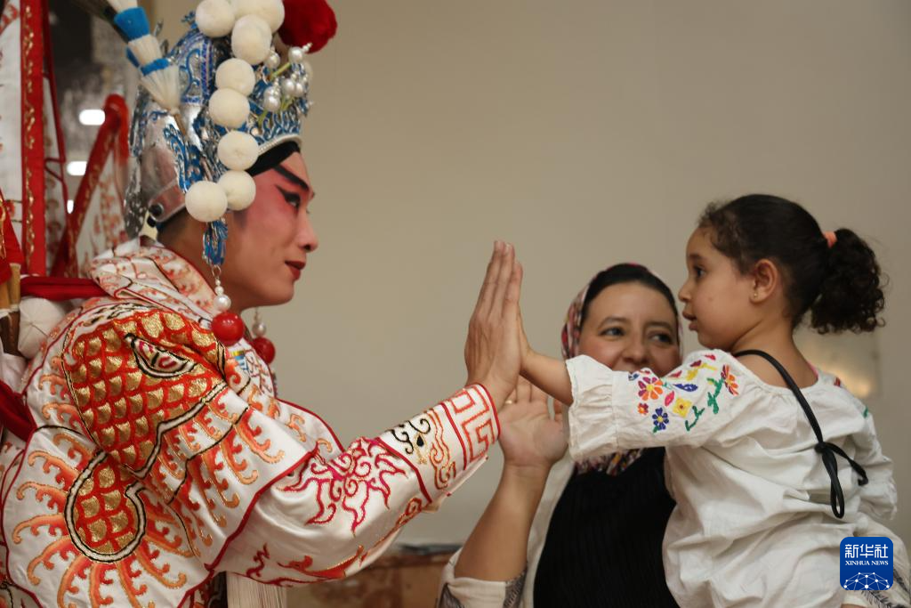 6月19日,在摩洛哥北部城市梅克内斯,广州粤剧院的演员与一名摩洛哥小观众击掌互动。