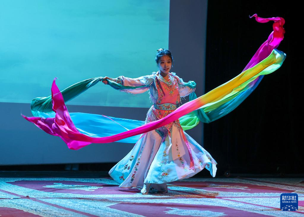 6月19日,在摩洛哥北部城市梅克内斯,广州粤剧院的演员表演长绸舞蹈。