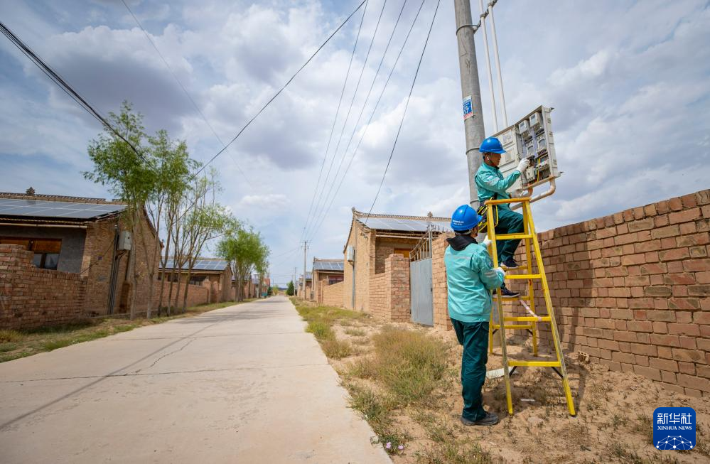 6月20日,宁夏同心县河西镇菊花台村,当地供电部门工作人员对农户的光伏并网低压计量装置进行检查。