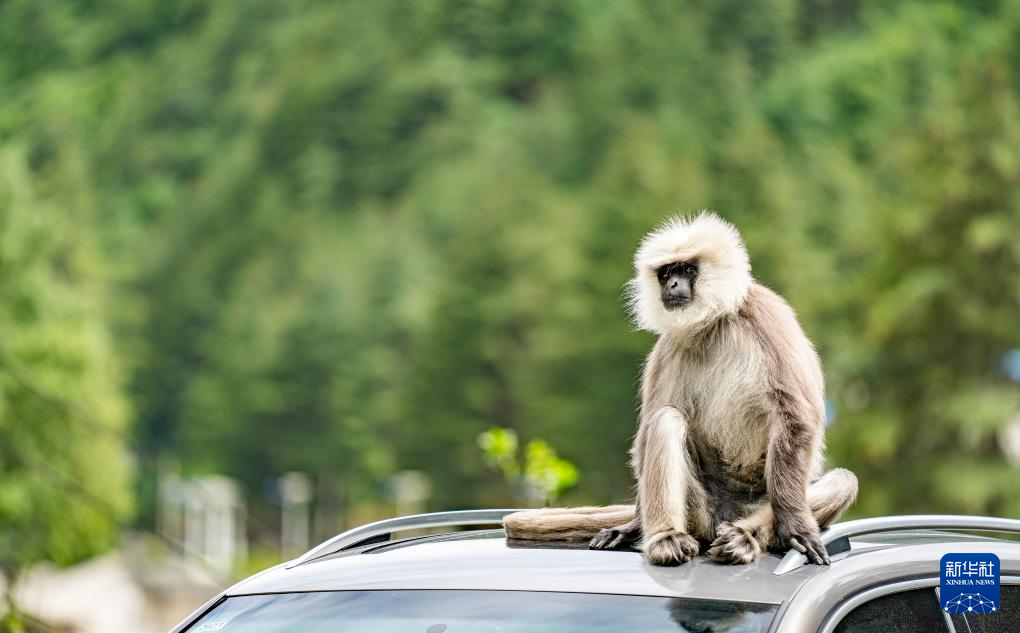 6月20日,在亚东县一条公路边,一只长尾叶猴蹲坐在车顶休息观望。