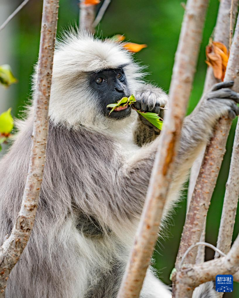 6月20日,在日喀则市亚东县,一只长尾叶猴在吃树叶。