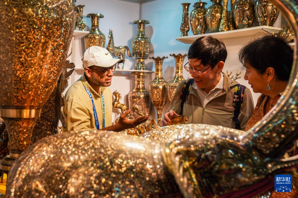 6月20日,顾客在南亚馆巴基斯坦展区选购铜制工艺品。