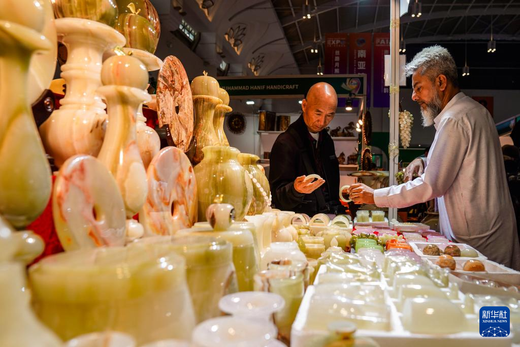 6月20日,顾客在南亚馆巴基斯坦展区选购玉石工艺品。