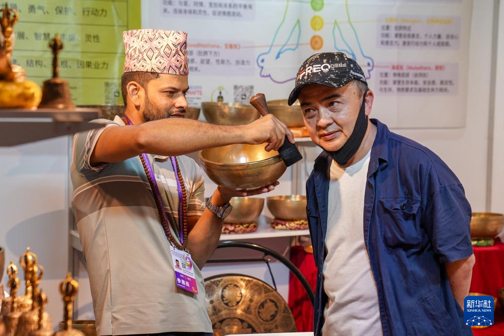6月21日,顾客在南亚馆尼泊尔展区体验颂钵。