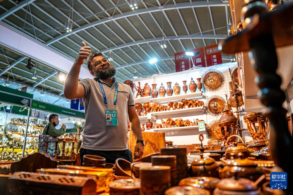 6月21日,第9届中国—南亚博览会南亚馆巴基斯坦展区的参展商对观众比出大拇指。