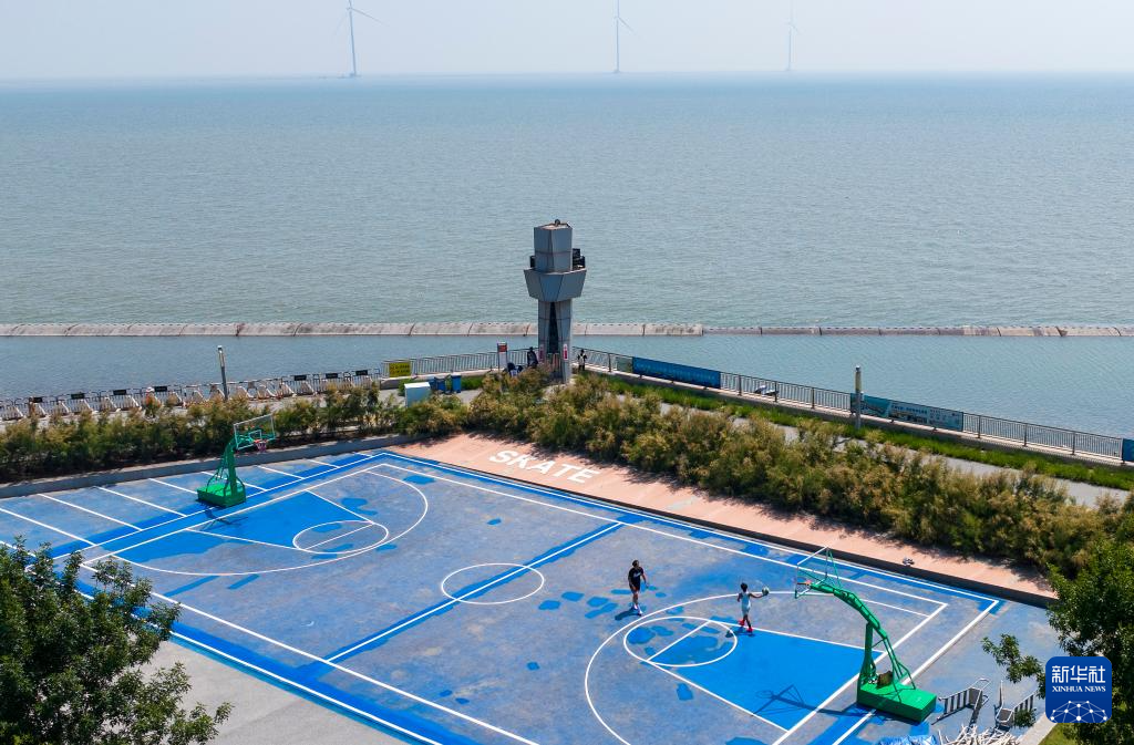 6月21日,游客在天津东疆亲海公园的一处篮球场打篮球(无人机照片)。