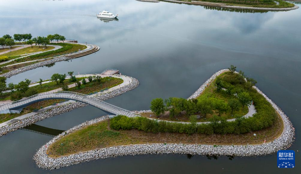 6月19日,一艘游船行驶在天津市滨海新区南湾公园(无人机照片)。