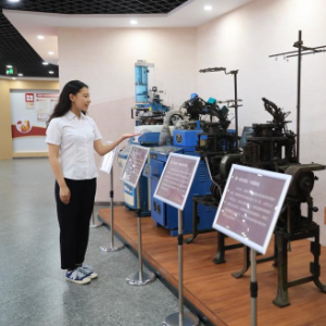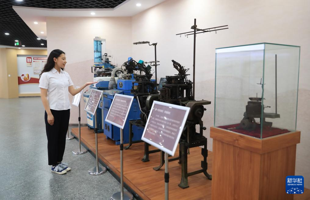 2025年6月20日,在小北河袜业产业展示馆,工作人员介绍织袜机的演变更新情况。