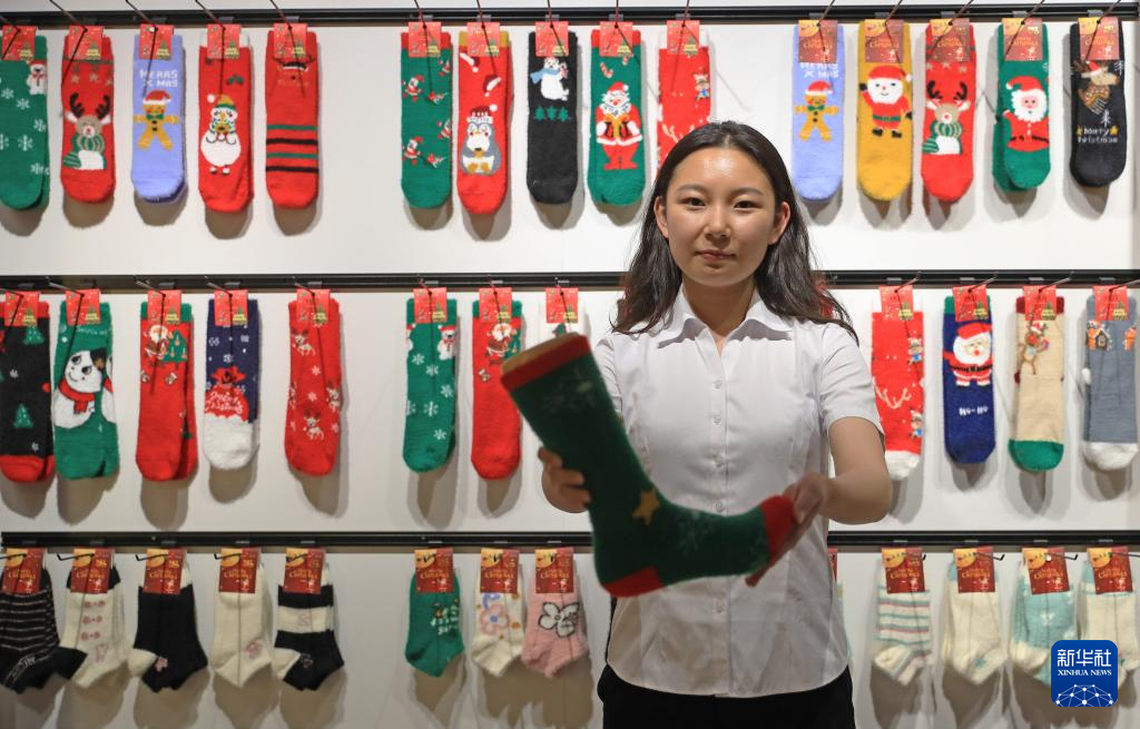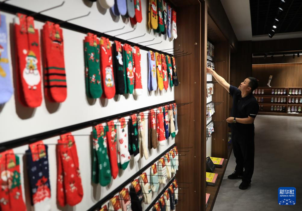 2025年6月20日,在小北河袜业产业展示馆,工作人员展示袜子。