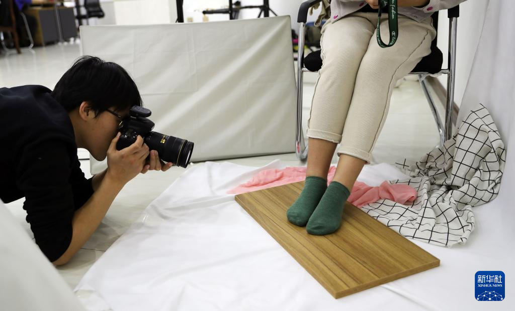2020年1月7日,在小北河袜艺城,工作人员拍摄袜子图片用于互联网销售。