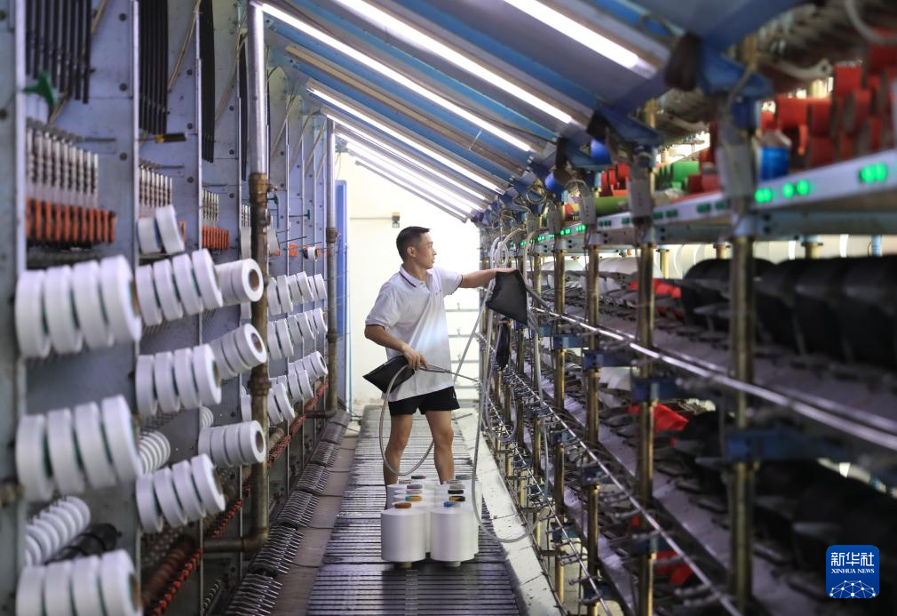 2025年6月20日,在辽宁众鑫加弹有限公司,工人在车间进行接线挂丝工作。