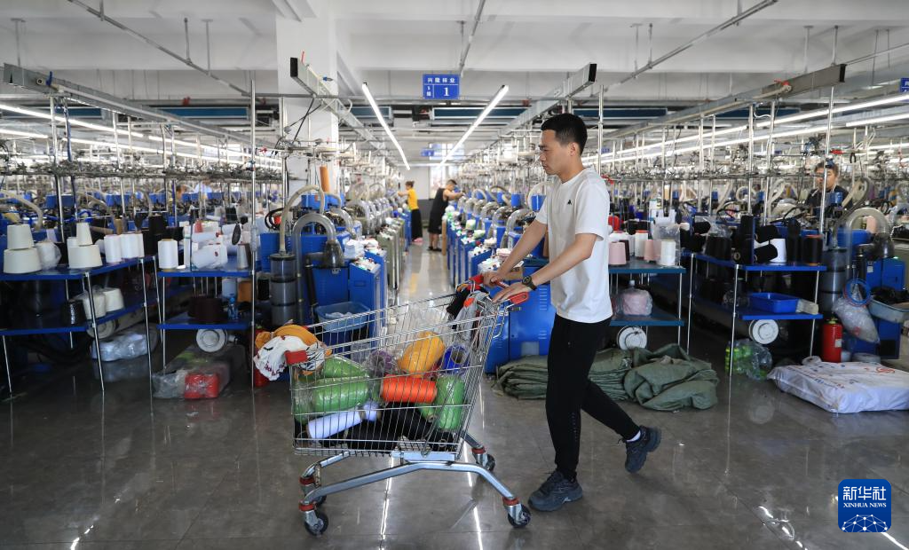 2025年6月20日,在辽阳县兴隆针织厂,工人在车间运送生产袜子的原料包覆纱线。
