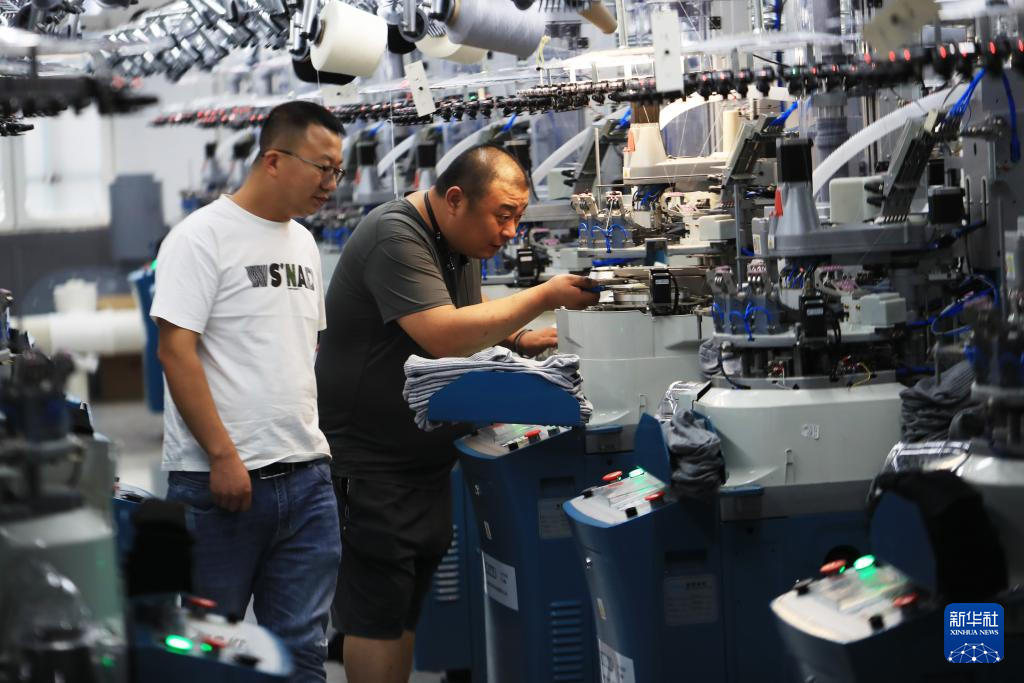 2025年6月20日,在辽阳县兴隆针织厂,工人在车间调试织袜机。