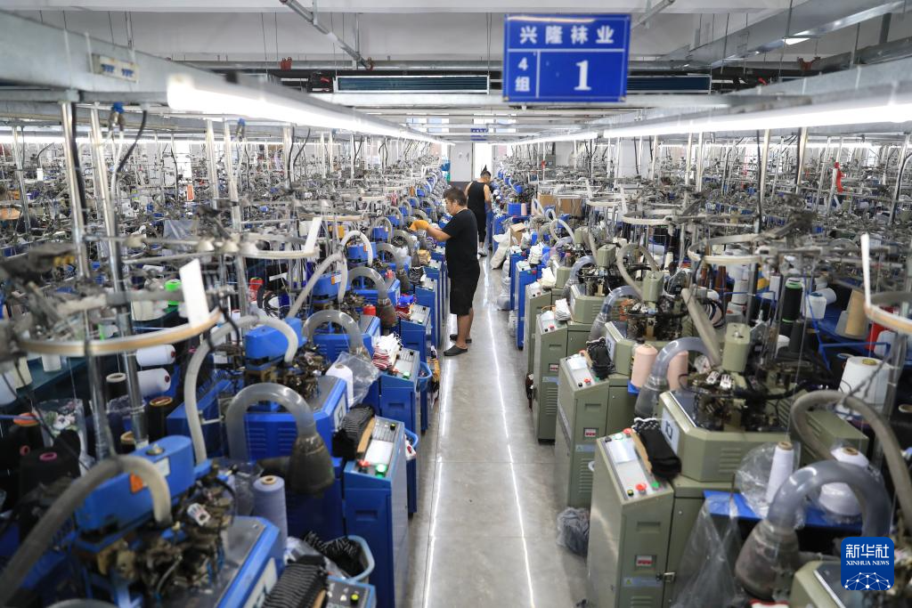 2025年6月20日,在辽阳县兴隆针织厂,工人在车间生产袜子。