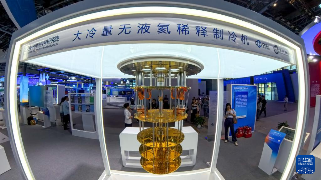 参观者在中关村展示中心了解展出的大冷量无液氦稀释制冷机(6月20日摄)。
