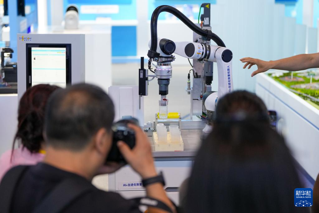 参观者在中关村展示中心观看一台“AI+自进化称重机器人”的液体称重展示(6月20日摄)。