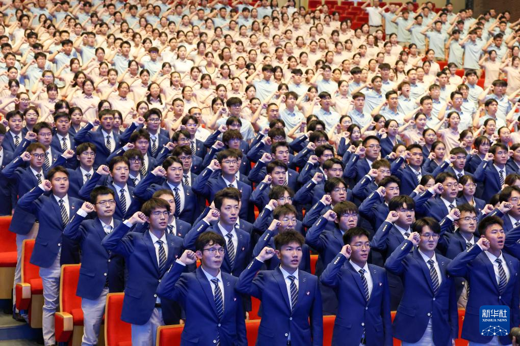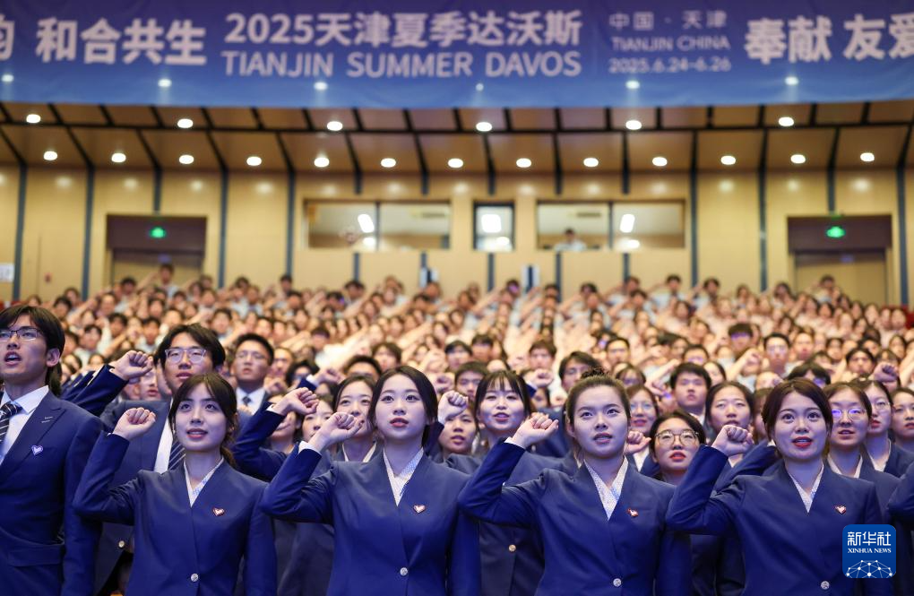 6月21日,在天津大学北洋园校区,志愿者在2025天津夏季达沃斯论坛志愿者上岗仪式上宣誓。