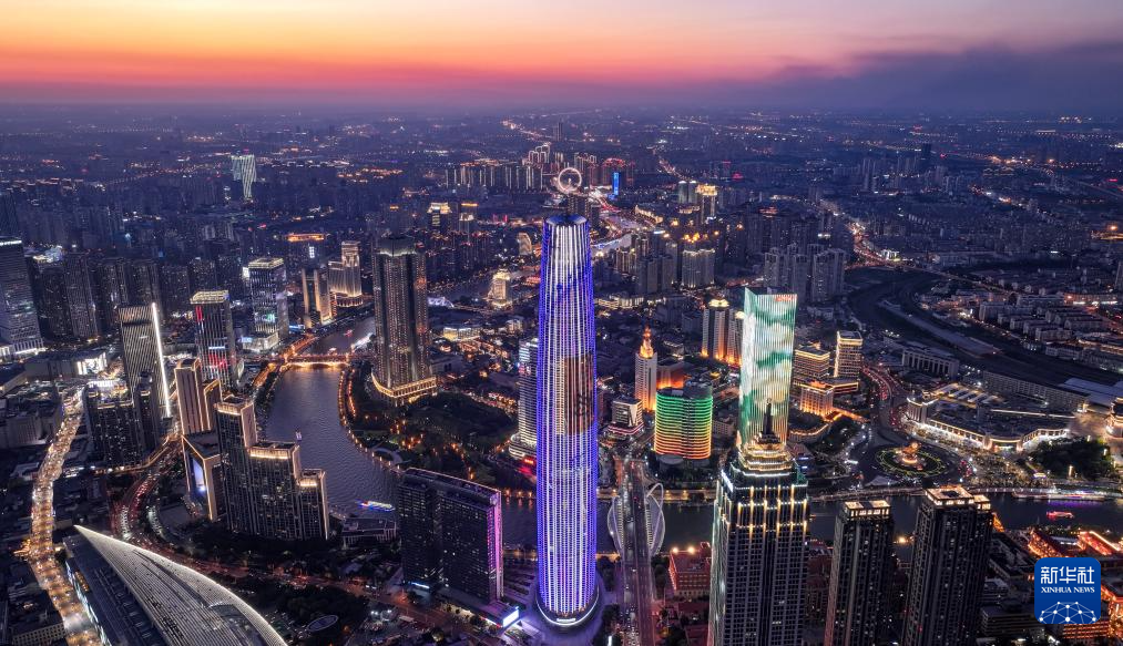 这是6月21日拍摄的天津环球金融中心(中)(无人机照片)。