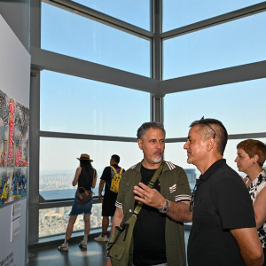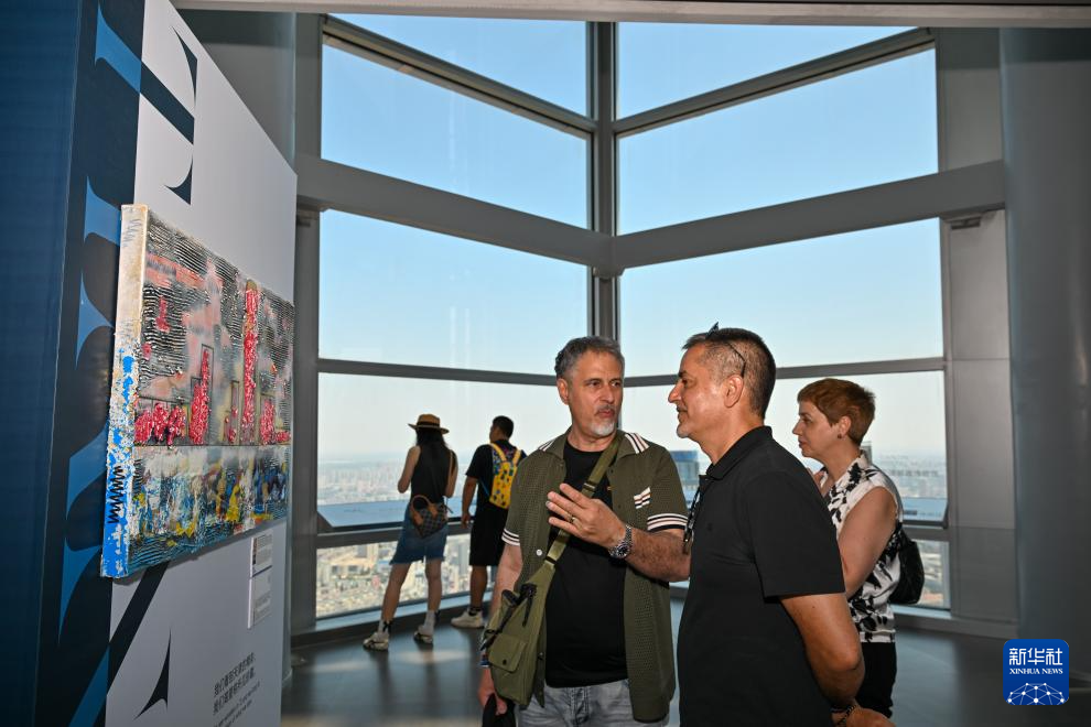 6月22日,外国游客在“天津之心”津塔观光厅参观。