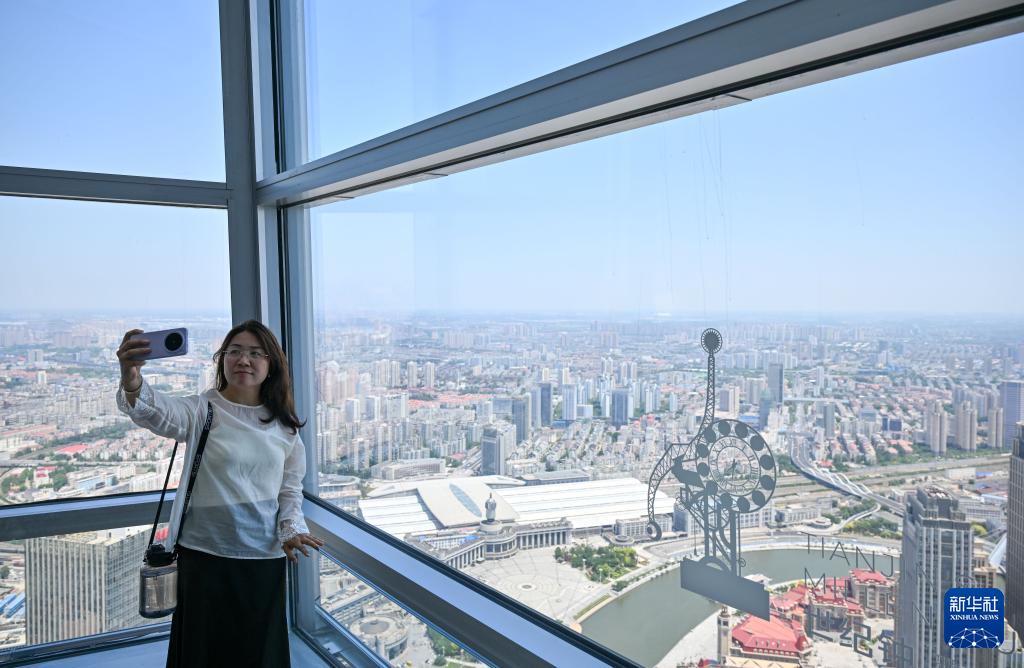 6月22日,游客在“天津之心”津塔观光厅与城市风光合影。