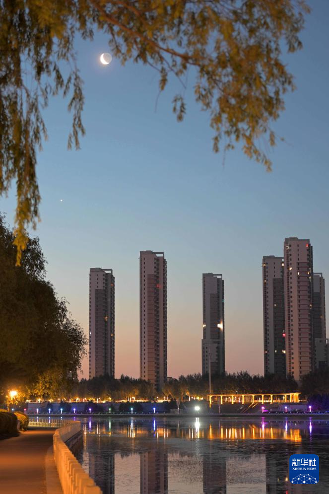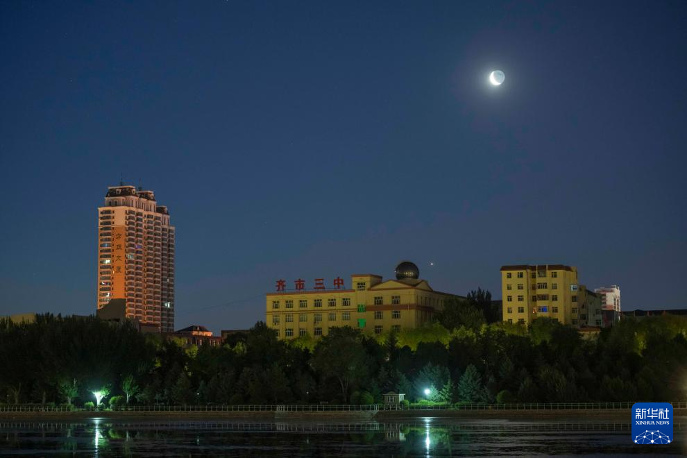 6月22日凌晨在黑龙江省齐齐哈尔市劳动湖景区拍摄的金星伴月。