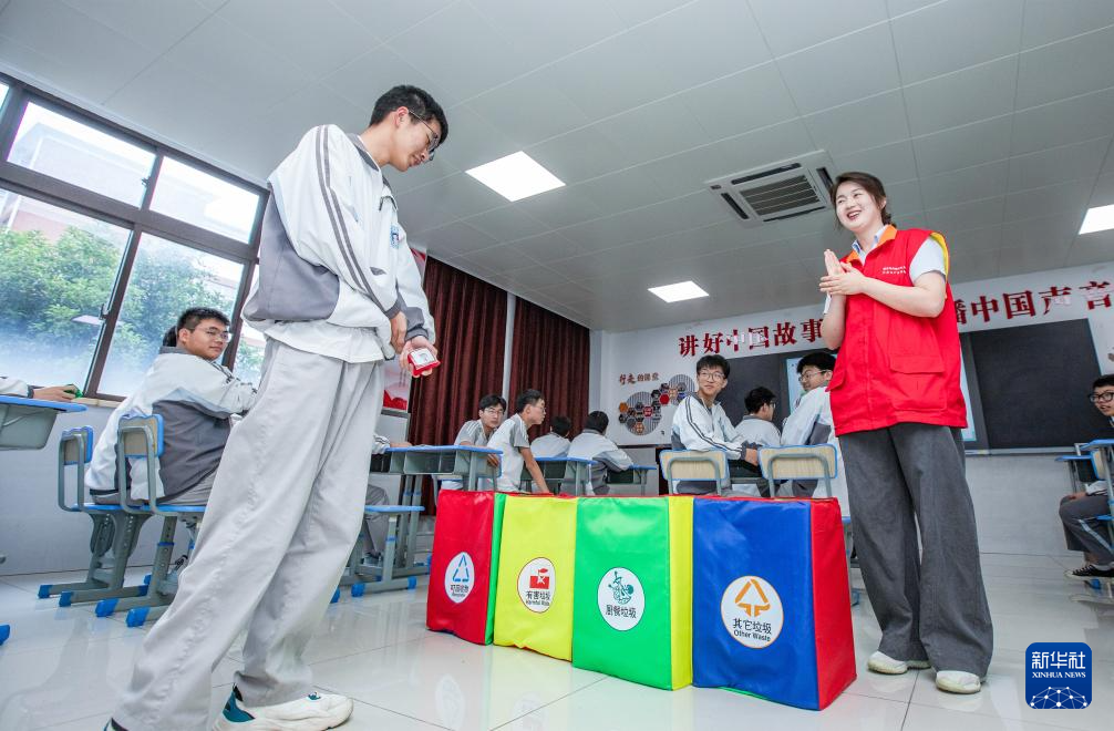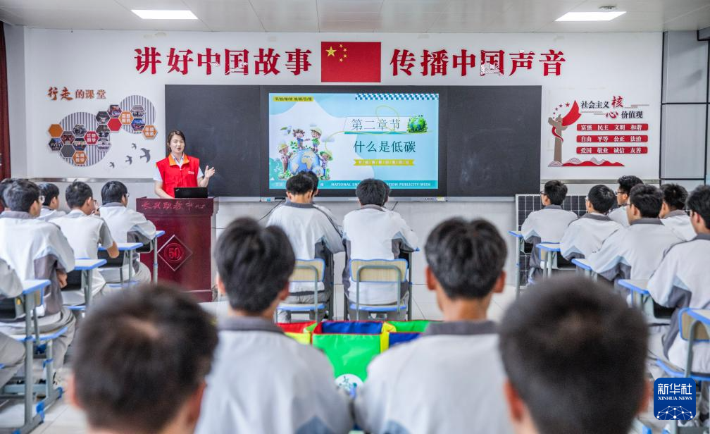 6月23日,国网湖州供电公司的志愿者在课堂上给湖州长兴职教集团雉山校区学生开展绿色低碳宣讲,普及绿色能源知识。