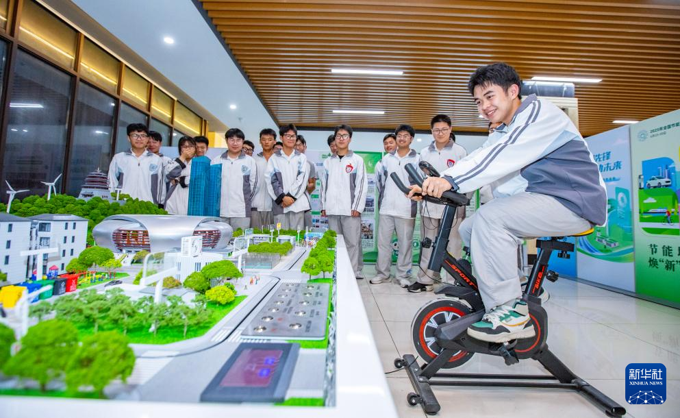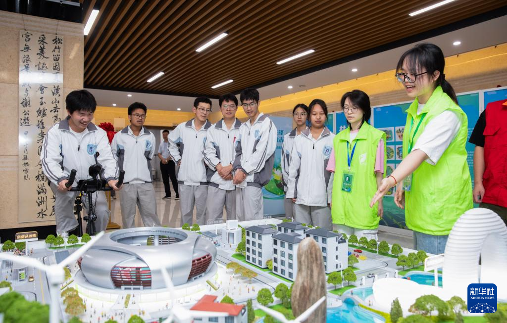 6月23日,湖州长兴职教集团雉山校区学生观看低碳城市沙盘,了解绿色低碳在日常生产生活中的应用场景。
