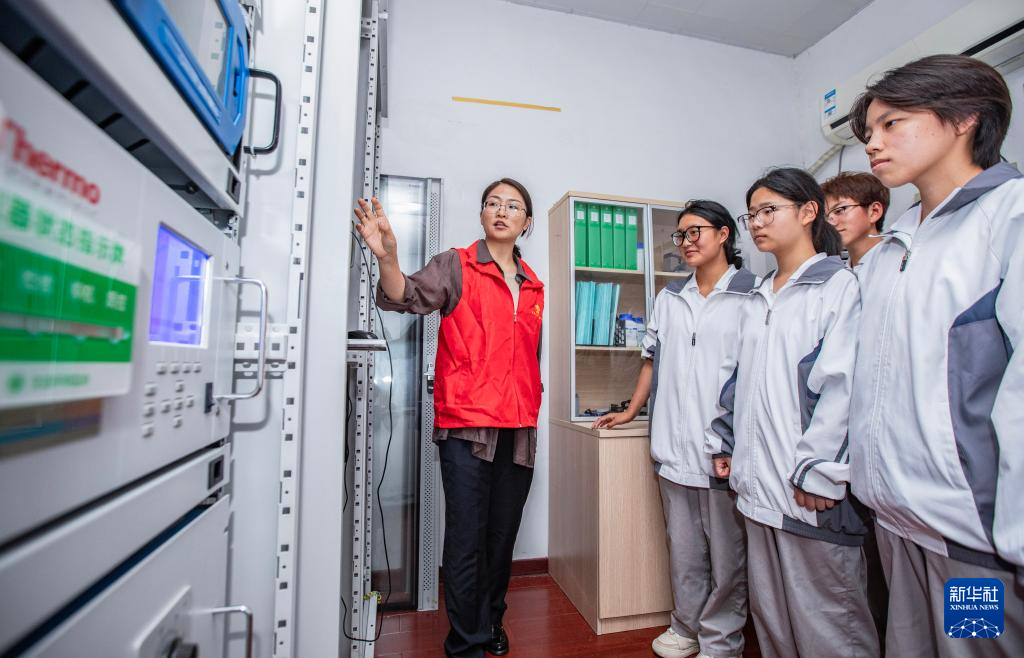 6月23日,湖州生态环境局长兴分局工作人员给湖州长兴职教集团雉山校区学生讲解大气监测站相关知识,介绍空气监测过程和空气质量指数。