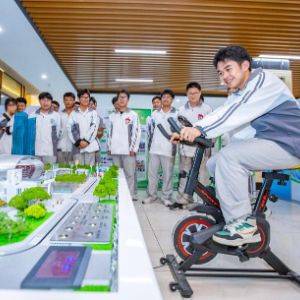 6月23日,湖州长兴职教集团雉山校区学生体验绿色单车游戏,直观感受减少碳排放量并获取碳积分。