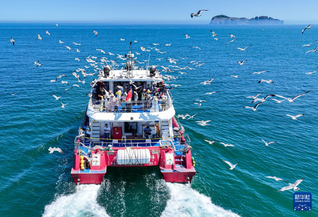 6月23日,在山东省荣成市海驴岛海域,游客们乘船体验,并与黑尾鸥互动(无人机照片)。