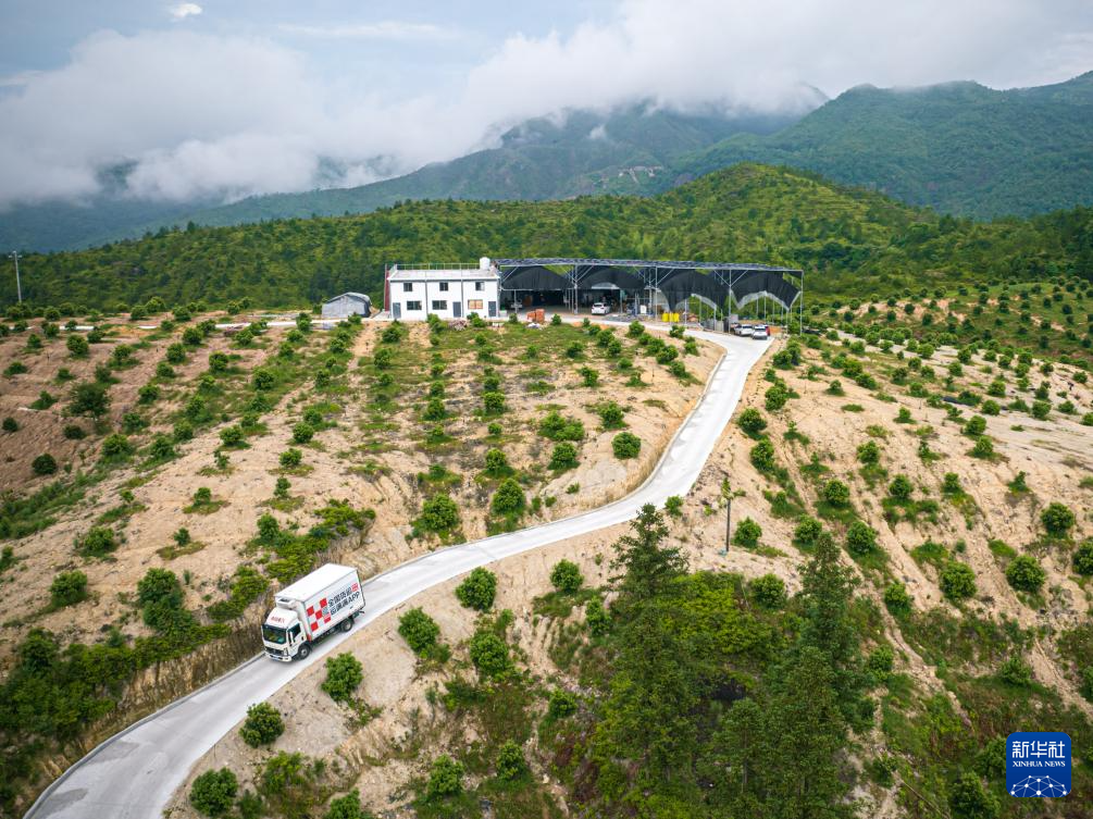 6月23日,冷链货车装载着东魁杨梅驶出杨梅种植园(无人机照片)。