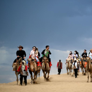 6月21日,游客在甘肃省敦煌市鸣沙山月牙泉景区骑骆驼游览。
